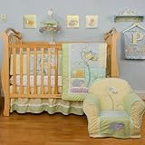 KidsLine 1800BED, Lovable little bumble bees, honey bees, lady bugs, dragonflies and snails frolicking amidst a delightful combination of pastel blues, greens, purple, peach and yellows make the Snug As A Bug 8 Piece Crib Bedding Set an absolute delight to the eyes. Refreshingly and softly colorful, these ultra-soft materials of quilted tufted and minky dot fabrics contribute to making this bedroom set the perfect nursery for your little one. The bedding set includes a quilt, dust ruffle, fitted sheet, diaper stacker and 3 piece fabric wall art. The patchwork quilt, with its many colored fabrics and little joyful and sleepy bugs, measures 36" x 45" and is 80% polyester/20% cotton, exclusive of decoration. The dust ruffle affords a pale yellow design field with a soft, white plush binding and green gingham border, fits a standard size crib, has a 14" drop, and is 65% polyester/35% cotton, exclusive of the cute bug decorations. Buzzing, hovering, fluttering and scooting little friends frequent the bright white fitted sheet which is 100% cotton and measures 28" x 52". The diaper stacker pleasingly accompanies this set with its powder blue, peach and green front and flap, decorated with a whimsical dragonfly caricature. It measures 12"x 25"x 9" and provides decorative hanging or setting storage for your child's diapers. Complementing the set with a 3 piece fabric wall art. Machine wash cold with like colors in gentle cycle, do not bleach, tumble dry low and iron on lowest setting as needed. ...